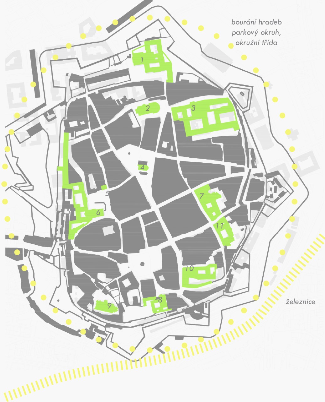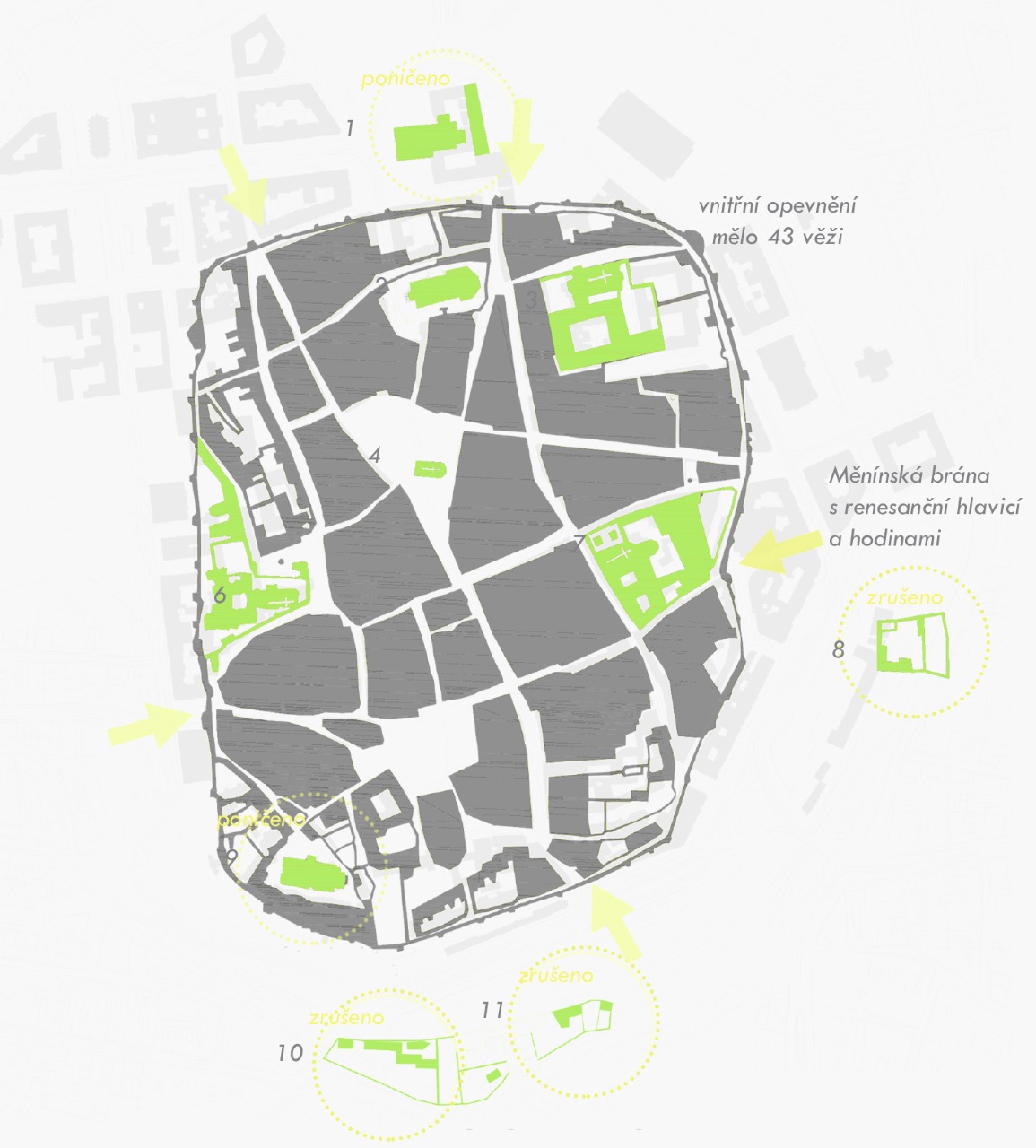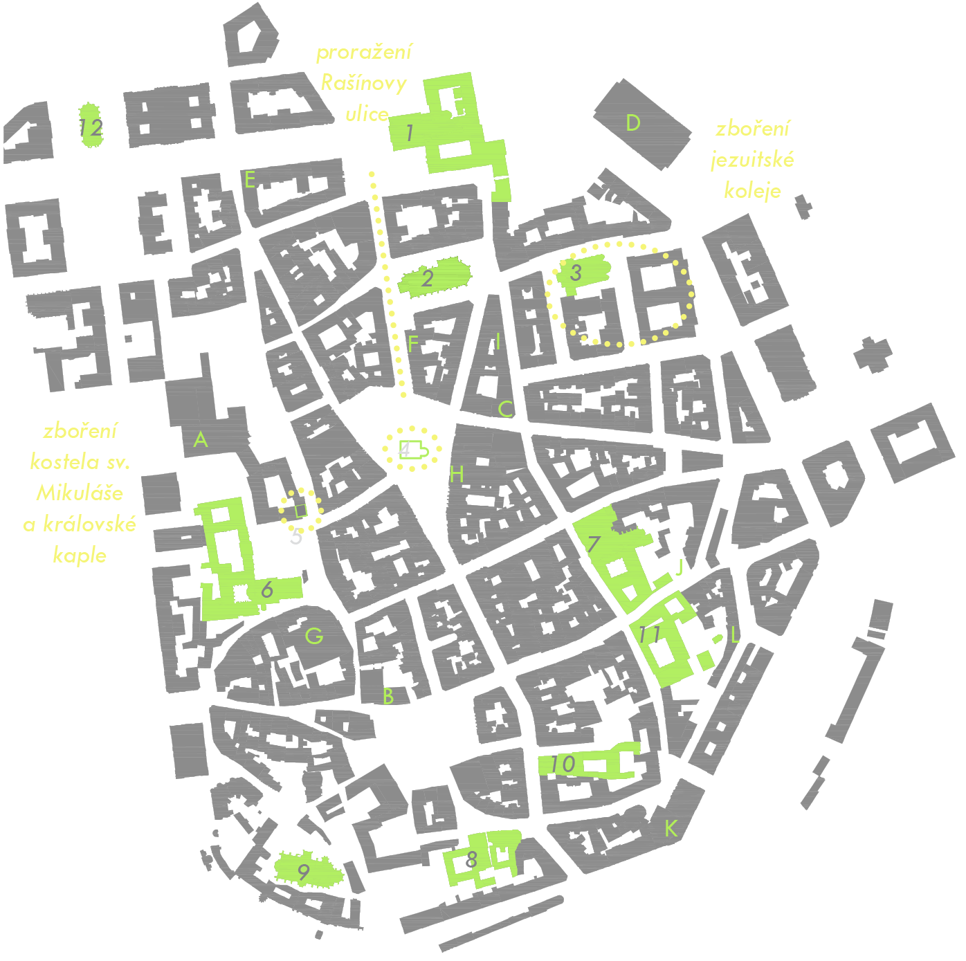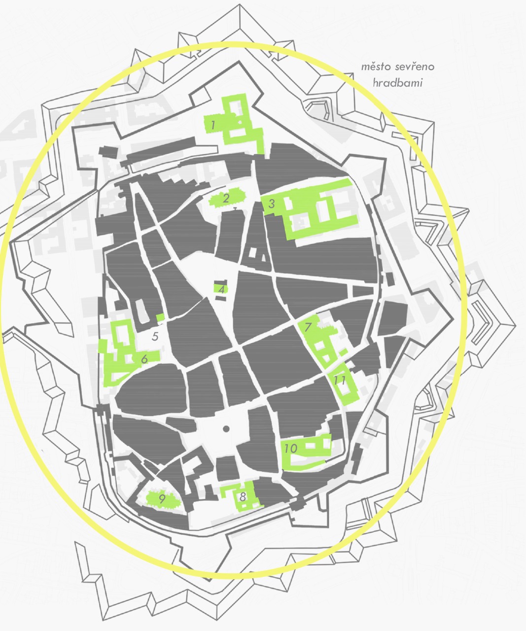 1. klášter augustiánů poustevníků / 2. kostel sv. Jakuba / 3. kolej jezuitů / 4. kostel sv. Mikuláše / 5. královská kaple / 6. klášter dominikánů / 7. klášter minoritů/ 8. klášter kapucínů / 9. kostel sv. Petra a Pavla / 10. klášter františkánů / 11. klášter voršilek / 12. červený kostel