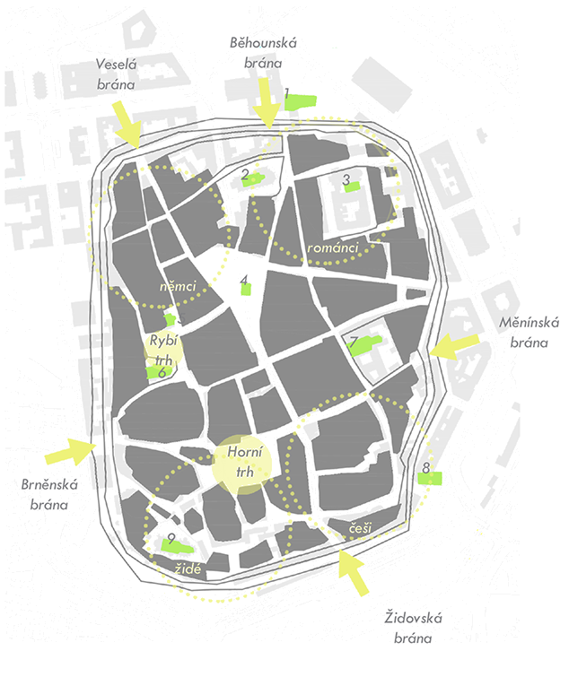 1. klášter augustiánů poustevníků / 2. kostel sv. Jakuba / 3. kolej jezuitů / 4. kostel sv. Mikuláše / 5. královská kaple / 6. klášter dominikánů / 7. klášter minoritů/ 8. kostel sv. Martina / 9. kostel sv. Petra a Pavla
